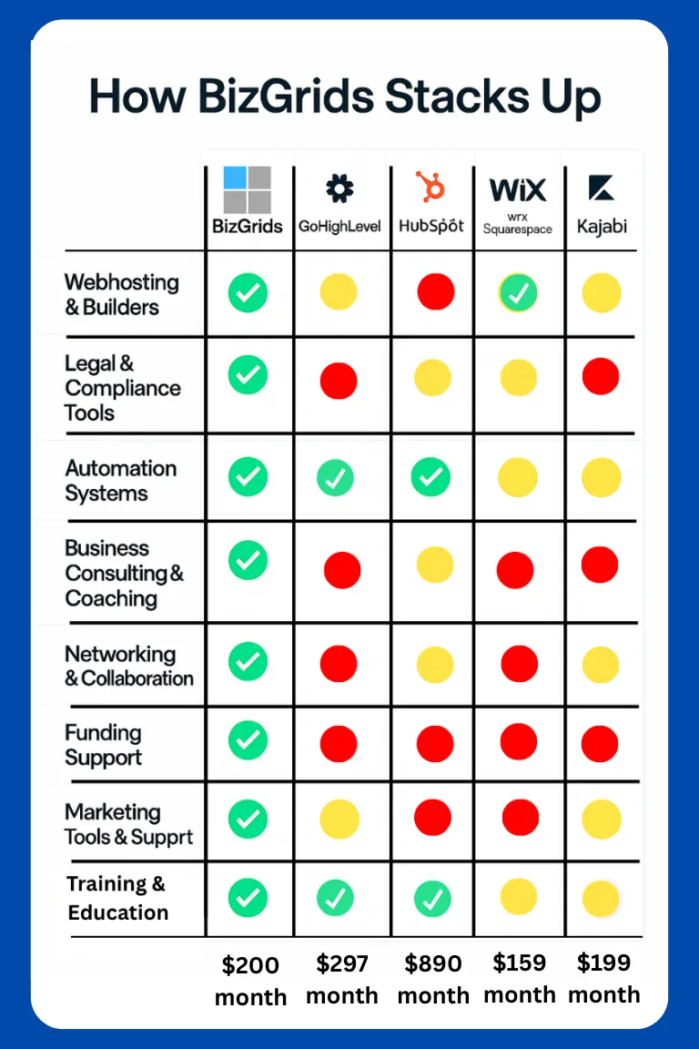 Unlike other platforms that only focus on one or two areas (like email marketing or website building), BizGrids offers a full-stack solution — including business consulting, networking, and funding tools — all at a flat $200/month. No upsells, no third-party add-ons required.